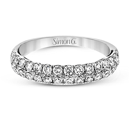 1. Simon G. Pavé Diamond Anniversary Band – This stunning 18K white gold anniversary ring dazzles with two rows of round pavé-set diamonds, offering a radiant shine to complement any engagement ring.