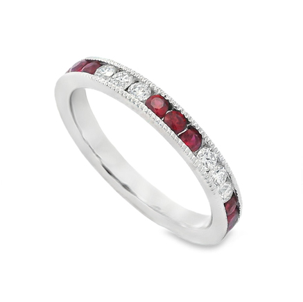 3. Roman Jewelers Signature Ruby & Diamond Ring – A romantic twist on tradition, this 14K white gold design pairs vivid rubies with diamonds and intricate milgrain detailing for a vintage-inspired finish.