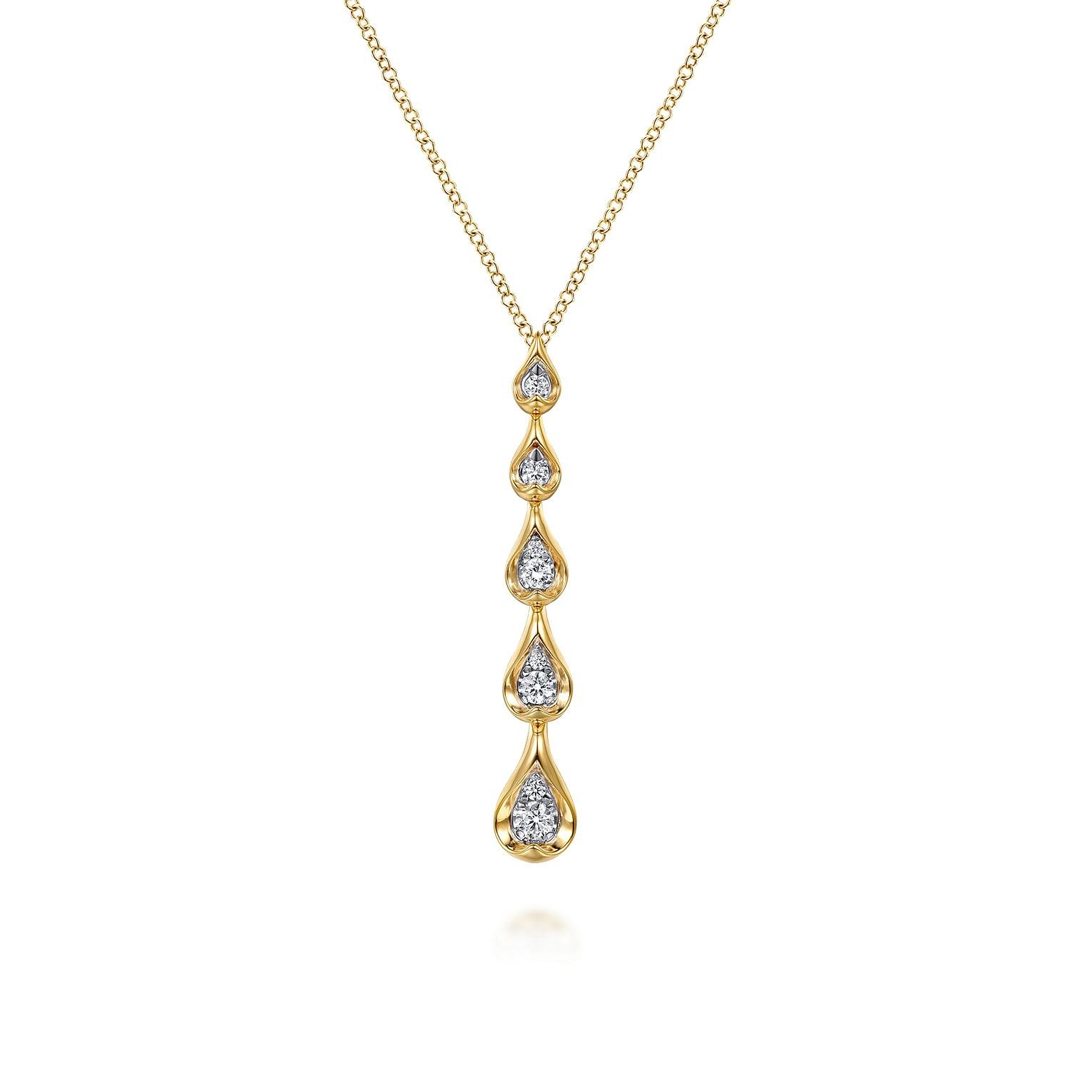 The two-tone style of the necklace, made of 14K yellow and white gold, makes it easy to mix warmth and brightness. The long drop shape of the necklace makes the round diamonds sparkle, which draws the eye and flatters the neckline. This piece is stackable and may be worn every day or on special occasions. It's perfect for people who like to mix metals or layer textured chains.